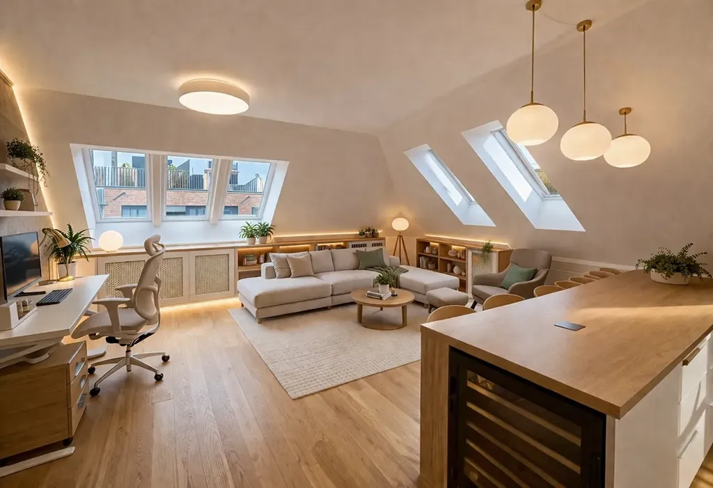 Interiér je proveden ve vysokém standardu s použitím kvalitních a nadčasových materiálů. Dřevěné podlahy v obytných místnostech a velkoformátová dlažba dodávají prostoru elegantní a reprezentativní charakter.