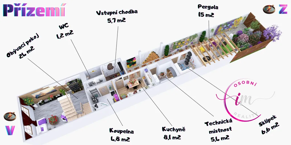 Dominantou dvorku u domu je bezesporu kouzelná pergola, která jako by zvala k dlouhým letním večerům plných smíchu s přáteli nebo tichým ránům s kávou, kdy se svět na chvíli zpomalí a ten okamžik patří jen Vám.