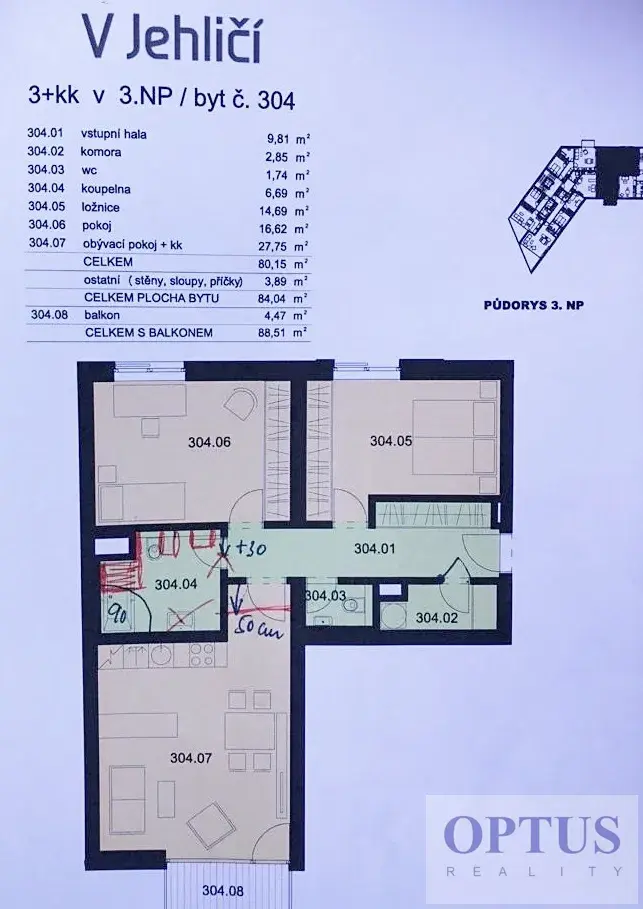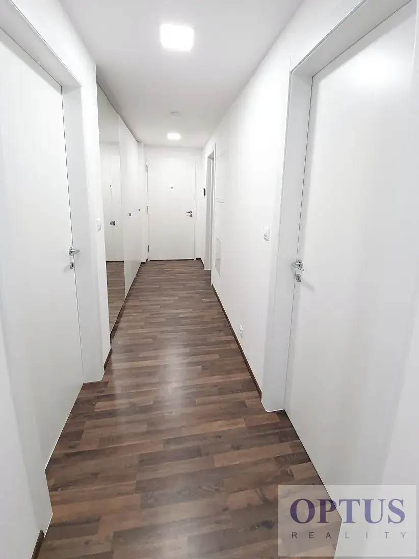 Nabízíme nadstandardní nezařízený byt 3 + kuchyňský kout (84,04 m2) + balkón 4,5 m2, situovaný ve 2. patře v novostavbě rezidenčního domu s výtahem z r. 2020. Byt tvoří obývací pokoj o velikosti 27,8 m2 s plně vybaveným kuchyňským koutem a se vstupem na jižně orientovaný balkon, 2 ložnice (16,6 m2 a 14,7 m2) s výhledem do parku - orientované na sever, koupelna s vanou + WC, samostatné WC, komora a vstupní hala s prostornými vestavěnými skříněmi.
