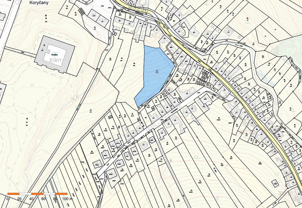 Pozemek je určen pro výstavbu řadových RD nebo izolovaných RD s nejvýše dvěma nadzemními podlažími. Vzhledem ke svým parametrům a umístění uprostřed obce Koryčany a výhledem na zámek je ideální místo pro bydlení, i jako investiční příležitost. Inženýrské sítě jsou k dispozici ve spodní části pozemku vzdálené asi 35 m. Příjezd k pozemku z vrchní části. V obci je k dispozici kompletní občanská vybavenost. Okolí pozemku přímo vybízí k vycházkám a výletům. V blízkosti je státní hrad Buchlov. Cena 3 300 Kč za m².