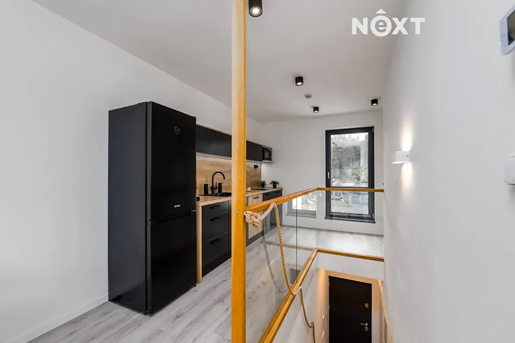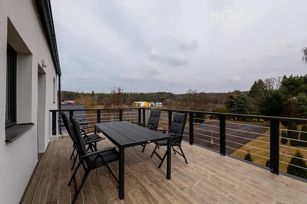 Novostavba bytu je umístěna v uzavřeném areálu, kam mají přístup pouze vlastníci bytů, jejich návštěvy a nebo popřípadě návštěvníci, pobývající v některém z bytů na víkend či odpočinek. V areálu jsou dva objekty se třemi a čtyřmi byty. Náš byt je umístěn v tom větším objektu, s přístupem v přízemí, ale celou hlavní dispozicí v 1. patře. Má dispozici 3+KK a výměru 63 m², bez teras. Ty jsou k dispozici dvě, první a větší (39 m²) je přístupná z (aktuálně) ložnice. Na druhou terasu (využitelných 18 m²) vstoupíte z hlavního obytného prostoru. Ta je vizuálně společná se sousedními byty. Kromě hlavního obytného prostoru je zde ložnice, dětský pokoj a koupelna s toaletou. Byt současný majitel využívá byt pro občasné víkendové pobyty a vybavení, které vidíte na fotografiích je po domluvě a v případě zájmu k dispozici.