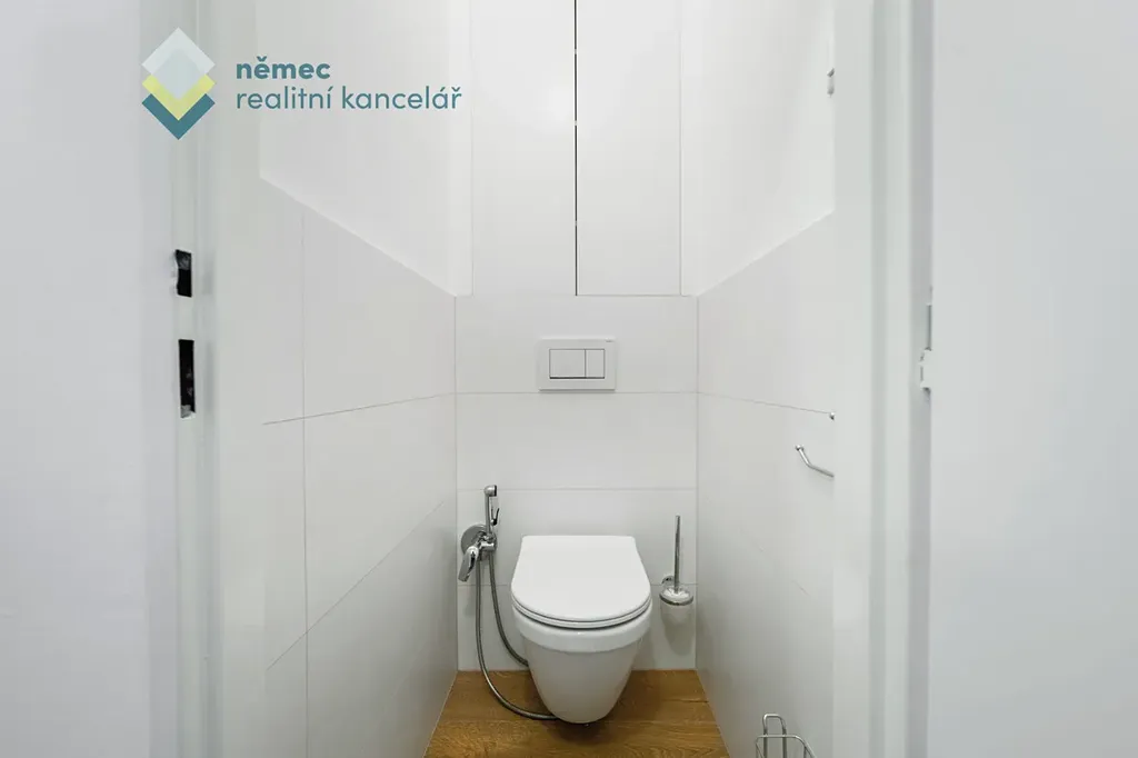 Koupelna (3,10 m²) – kvalitní vana Kaldewei Saniform Plus 170x70 cm smaltovaná ocel s Perl-effektem, prostorné umyvadlo Laufen Pro S 60×46,5 cm s velkým zrcadlem se světlem, koupelnová vestavěná skříň na hygienické potřeby, poličky s LED osvětlením za vanou. Příprava na hlubokou pračku i sušičku.