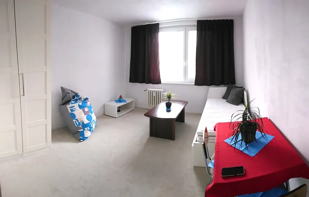 Dispozice bytu: obývací pokoj/ložnice s rozkládací sedačkou a skříněmi, chodba se zrcadlem s věšáky, oddělené WC, koupelna s vanou, umyvadlem a pračkou, kuchyň se sporákem a lednicí.
