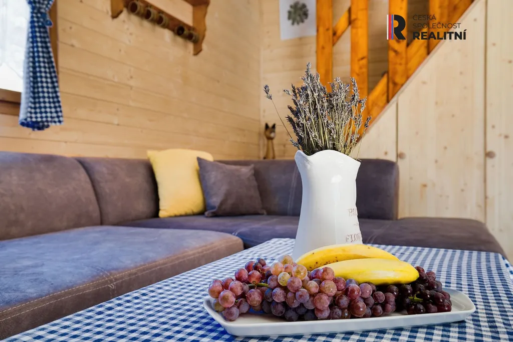 Obložení celého interiéru palubkami, nová kamna, Naftové nezávislé topení (bufík) s 10 l nádrží na autobaterii s regulací času a termostatem teploty - nemovitost se velmi snadno vytopí a je využívána i v zimních měsících.