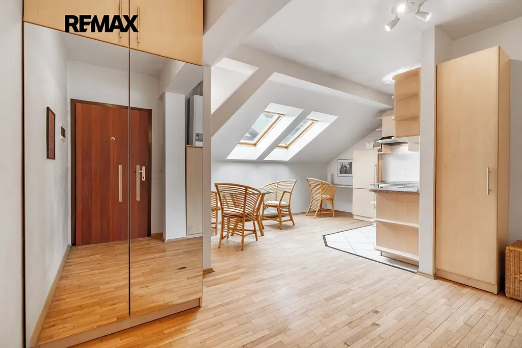Byt vyniká příjemnou atmosférou a dostatkem přirozeného světla, které do interiéru přivádějí střešní okna. Hlavní obytný prostor tvoří obývací část s kuchyňským koutem, vybaveným kuchyňskou linkou včetně spotřebičů a prostorem pro jídelní stůl. Samostatná ložnice poskytuje klid a dostatek soukromí. Součástí bytu je také koupelna se sprchovým koutem a toaletou.