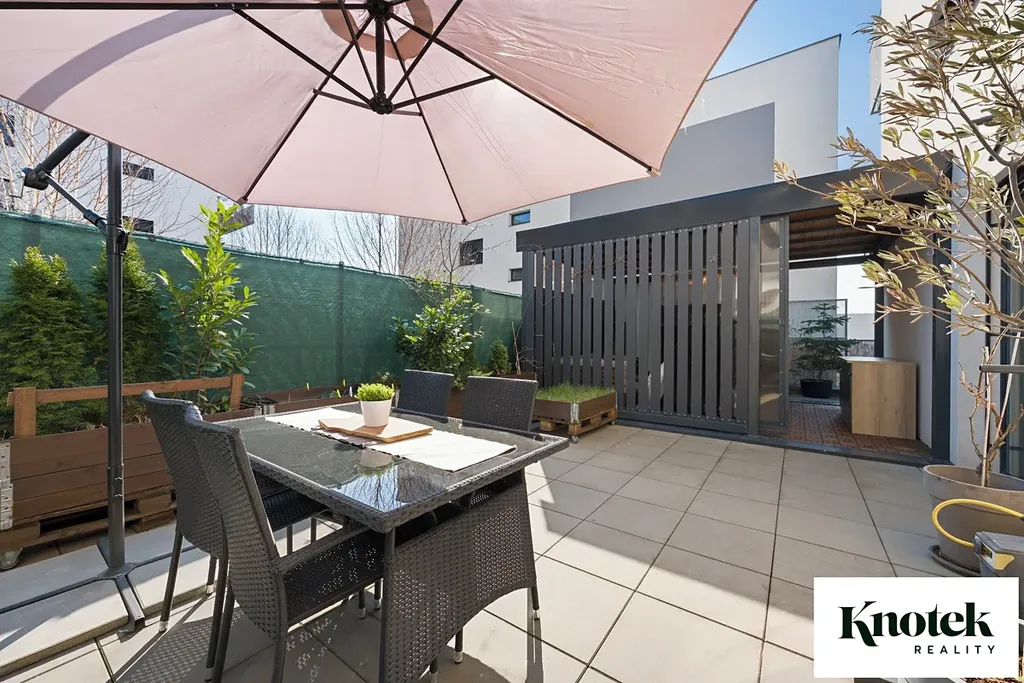 Zatímco jedna část terasy nabízí dostatek místa pro zeleň, posezení i úložný prostor, druhá část zajišťuje maximum soukromí pod moderně zařízenou pergolou, která představuje další prostor pro trávení volného času a relaxaci.