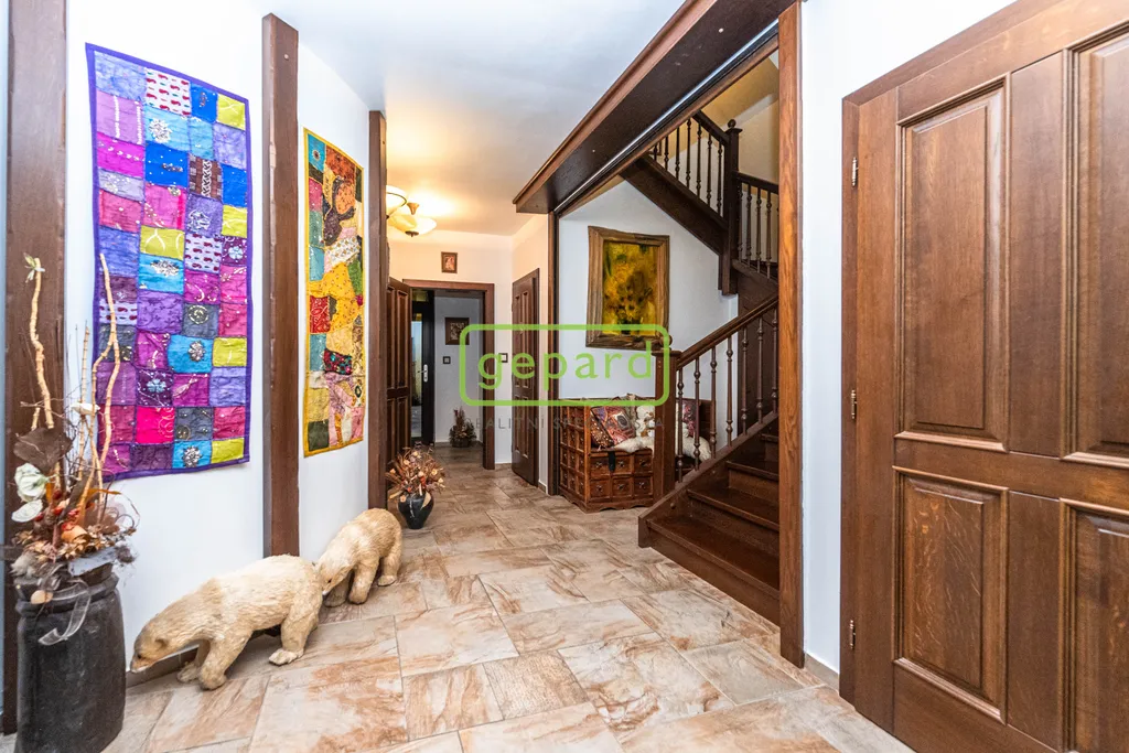 Dominantou domu je vnitřní bazén s protiproudem a samostatným odvlhčováním, dále posilovna, krb a tři plnohodnotné koupelny. Interiér je proveden z kvalitních a trvanlivých materiálů – dřevěná eurookna, masivní dubové schodiště, keramické dlažby a dřevěné podlahy – s důrazem na eleganci a dlouhodobou hodnotu.