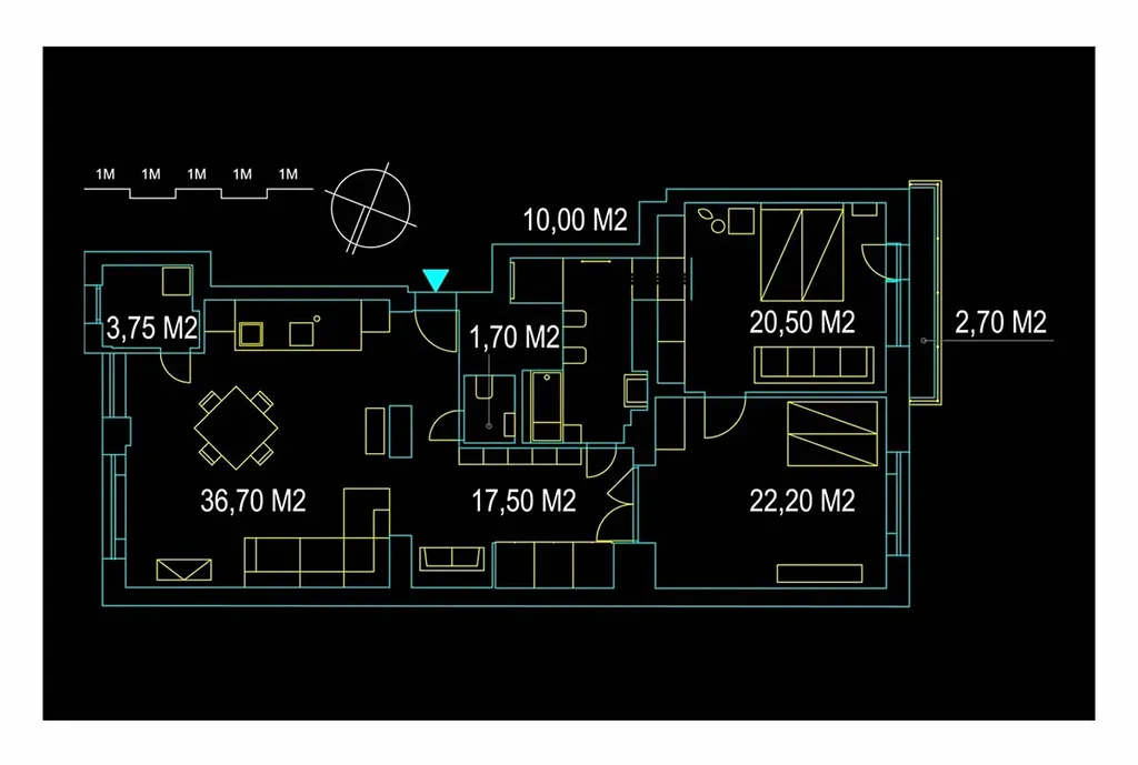 Dispozice zahrnuje otevřený obývací prostor s kuchyňským koutem, jídelnou a zónou pro relaxaci nebo práci, dvě samostatné ložnice, koupelnu s vanou, sprchou, WC a bidetem, samostatné WC a praktickou spíž/prádelnu.