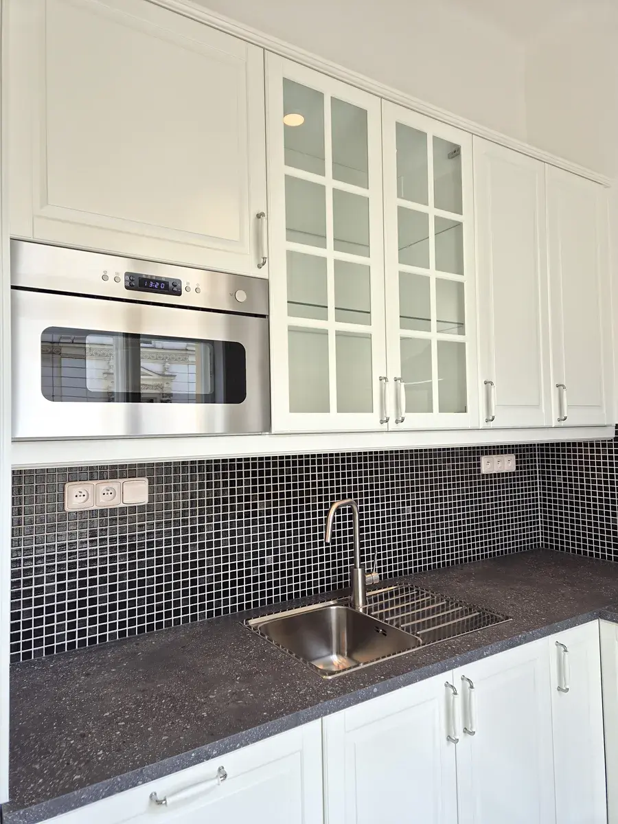 Zařízení: kuchyňská linka s vestavěnými spotřebiči ( lednice s mrazničkou, mikrovlnná trouba, indukční deska, el. trouba a digestoř).