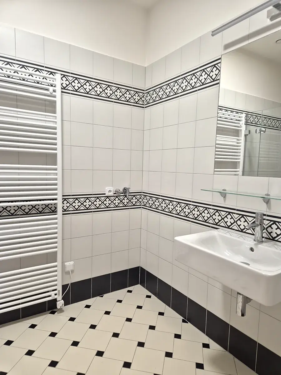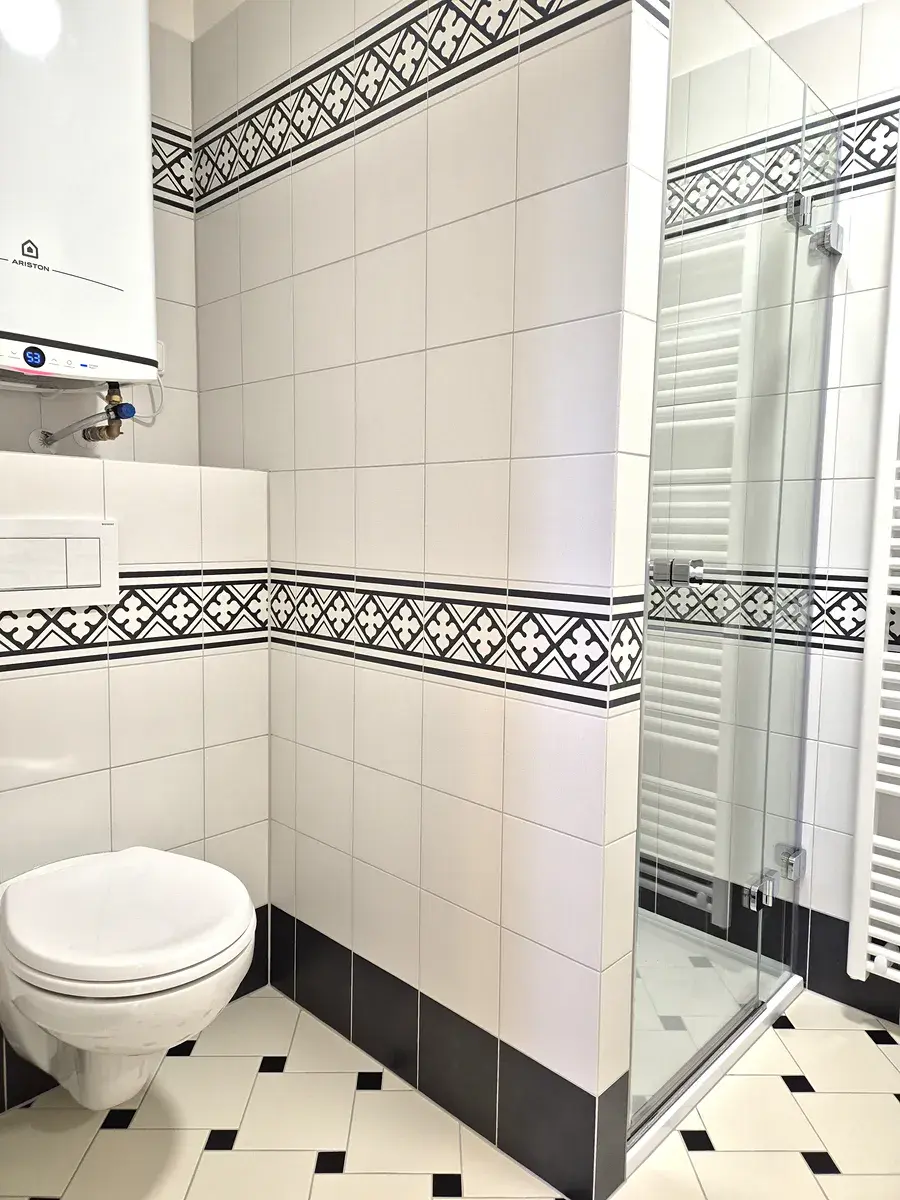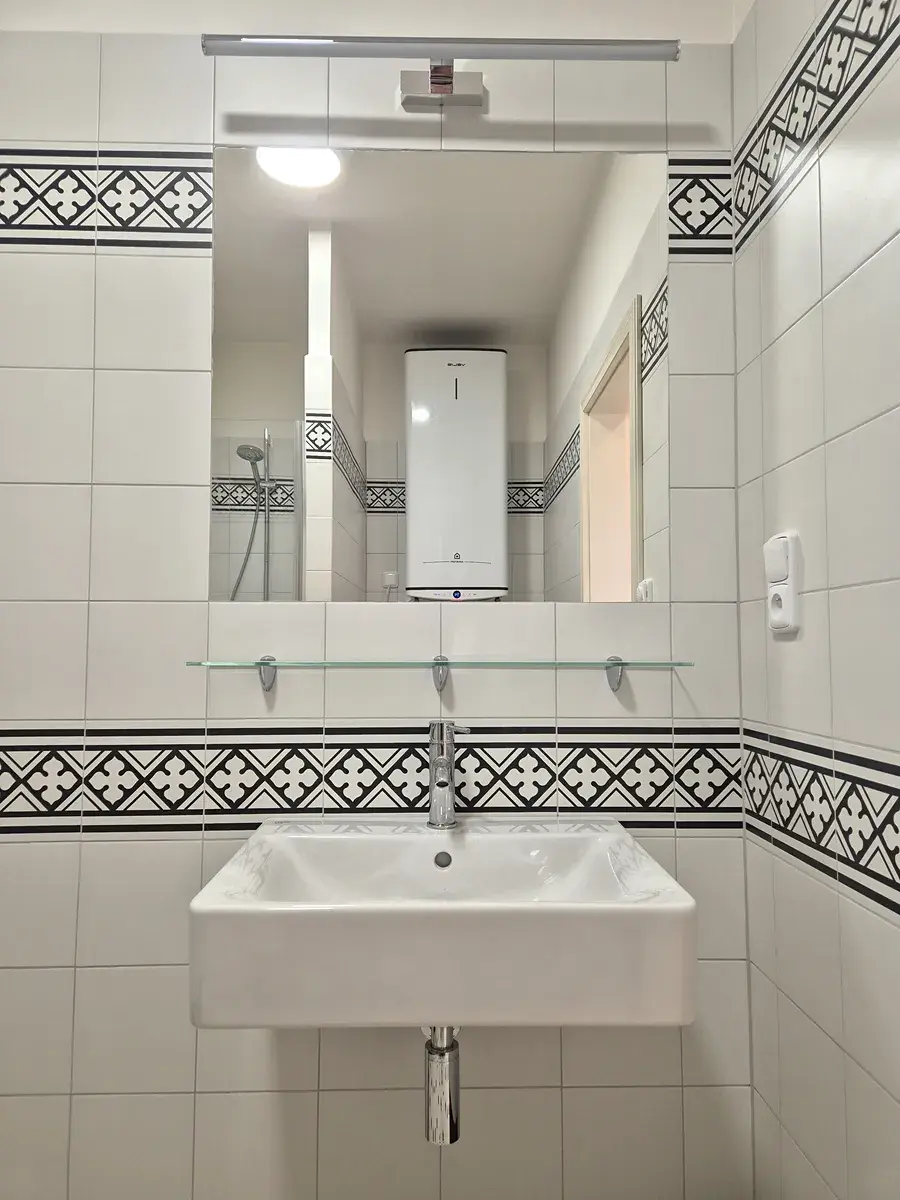 Moderní interiér bytu o rozloze 40m2 se sestává ze vstupní předsíně, prostorného obývacího pokoje, kuchyně, koupelny s wc a sprchovým koutem.