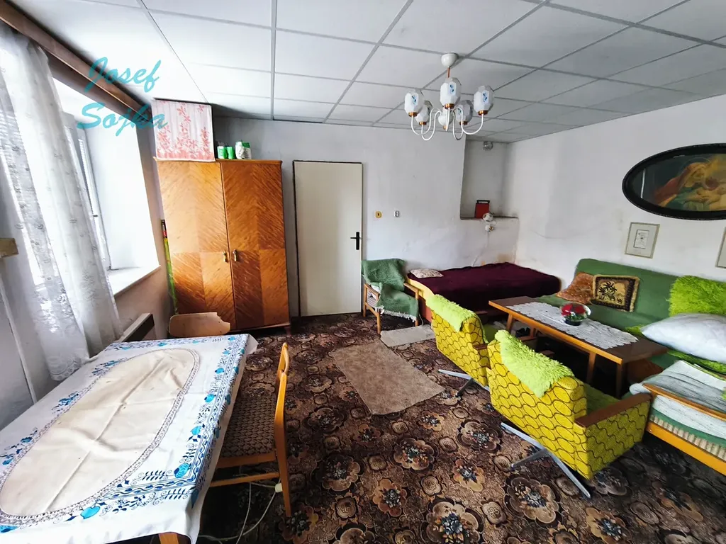 vstupní chodba, kuchyně 16m2, pokoj 25m2, koupelna s WC 3m2, spížka 3 m2. Z chodby je přístup na prostornou půdu, kde se nabízí prostor pro další obytné místnosti. Na dům navazuje chlév a dílna.