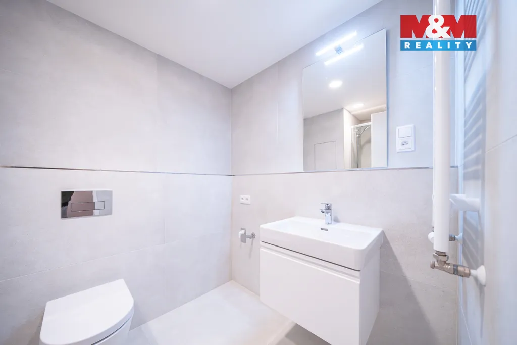 Koupelna je provedena ve vyšším standardu (Laufen, Grohe) a nabízí sprchový kout, toaletu, umyvadlo se skříňkou, vyhřívaný žebřík i přípojky na pračku a sušičku.