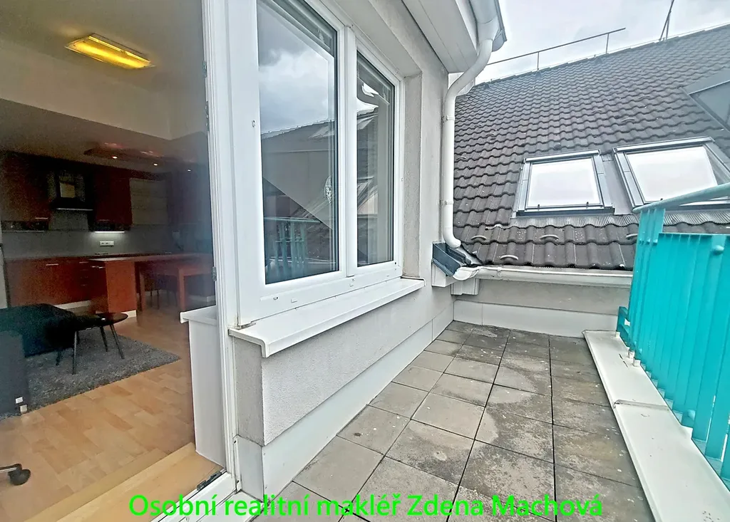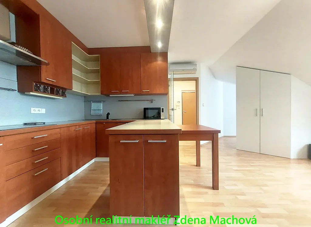 Půdní byt o dispozici 2+kk s balkonem se nachází v 6. patře cihlové novostavby s výtahem. Podlahová plocha činí 48,3 m² + balkon o rozloze 4.2m2. Dominantou bytu je prostorný obývací pokoj s kuchyňským koutem, který je vybaven moderní kuchyňskou linkou s vestavěnými spotřebiči a pračkou. Součástí prostoru je také praktická uzavřená komora umístěná hned vedle kuchyňské linky. Z obývacího pokoje je vstup na balkon (západní strana) s příjemným výhledem do klidného vnitrobloku. Druhou místností je samostatná ložnice, která je částečně oddělena šatní skříní umístěnou v obývacím pokoji. Zde je velká postel a hluboká šatní vestavěná skříň. Koupelna je spojena s WC a vybavena sprchovým koutem a koupelnovým nábytkem. Ve vstupní předsíni se nachází vestavěná skříň. Podlahy tvoří plovoucí podlaha v kombinaci s dlažbou. V celém bytě je instalována klimatizace, jejíž spotřeba je již zahrnuta v měsíčních poplatcích. Vytápění a ohřev vody jsou zajištěny centrálním dalkovym vytápěním. Lokalita nabízí výbornou občanskou vybavenost i skvělou dopravní dostupnost. V docházkové vzdálenosti se nachází obchody, restaurace, kavárny, školy i zdravotnická zařízení. Zastávky MHD jsou v bezprostřední blízkosti domu a stanice metra linky A – Strašnická je snadno dostupná. Pro relaxaci a volnočasové aktivity lze využít nedaleký park Gutovka s dětskými hřišti, sportovišti a množstvím zeleně. Byt je vhodný pro dlouhodobé bydlení, trvalý pobyt je možný.