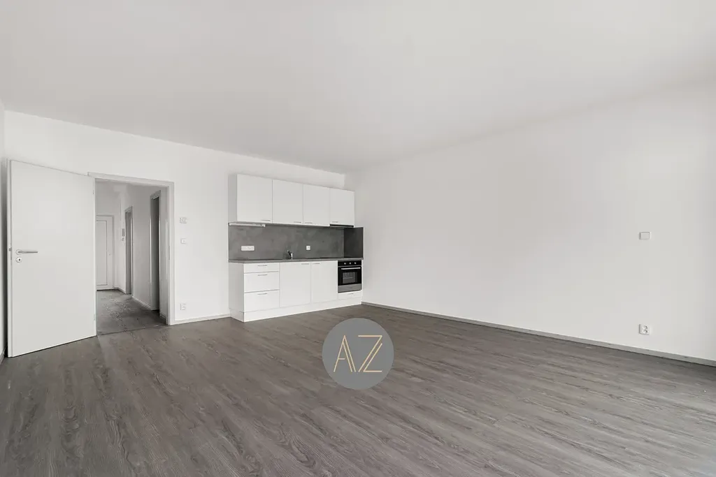 Přímo naproti vchodovým dveřím se na konci chodby nachází obývací pokoj s kuchyňským koutem. V obývacím pokoji jsou francouzská okna a vstup na prostornou lodžii s osvětlením a zásuvkou.