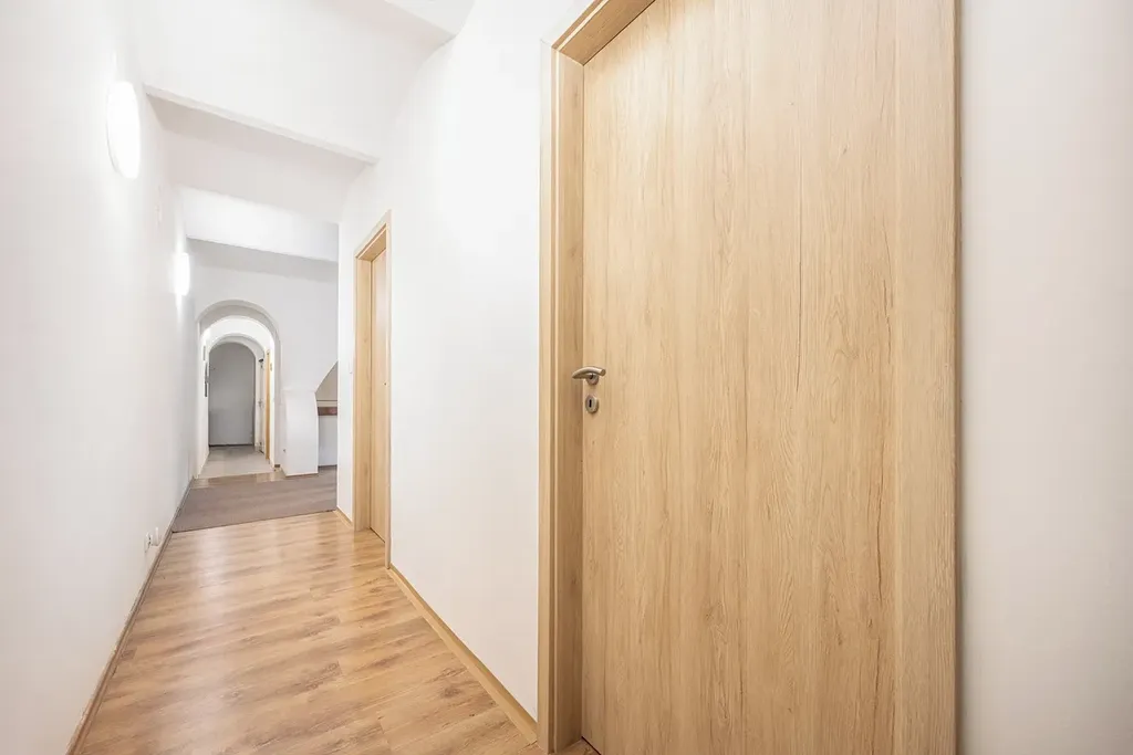 Byt má vstup z dvorní části domu a nabízí tři samostatné pokoje, samostatnou kuchyni s barovým pultem a jídelním prostorem, koupelnu se sprchovým koutem, samostatné WC, úklidovou místnost a chodbu. Dispozice umožňuje komfortní sdílené bydlení bez průchozích místností. Součástí užívání je také možnost posezení ve vnitřním dvoře domu.
