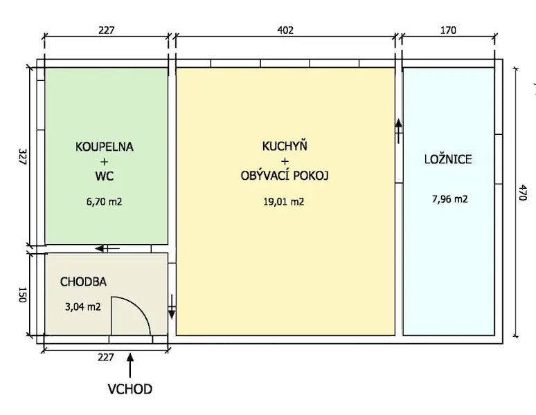 Dispozice bytu: Obývací pokoj s kuchyňským koutem 19,1 m2, pokoj 7,96 m2, koupelna s WC 6,70 m2, chodba 3,04 m2.