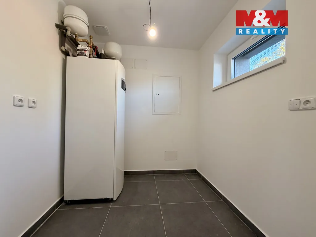 Disponuje tepelným čerpadlem, má přípravu na rekuperaci a venkovní elektrické žaluzie.