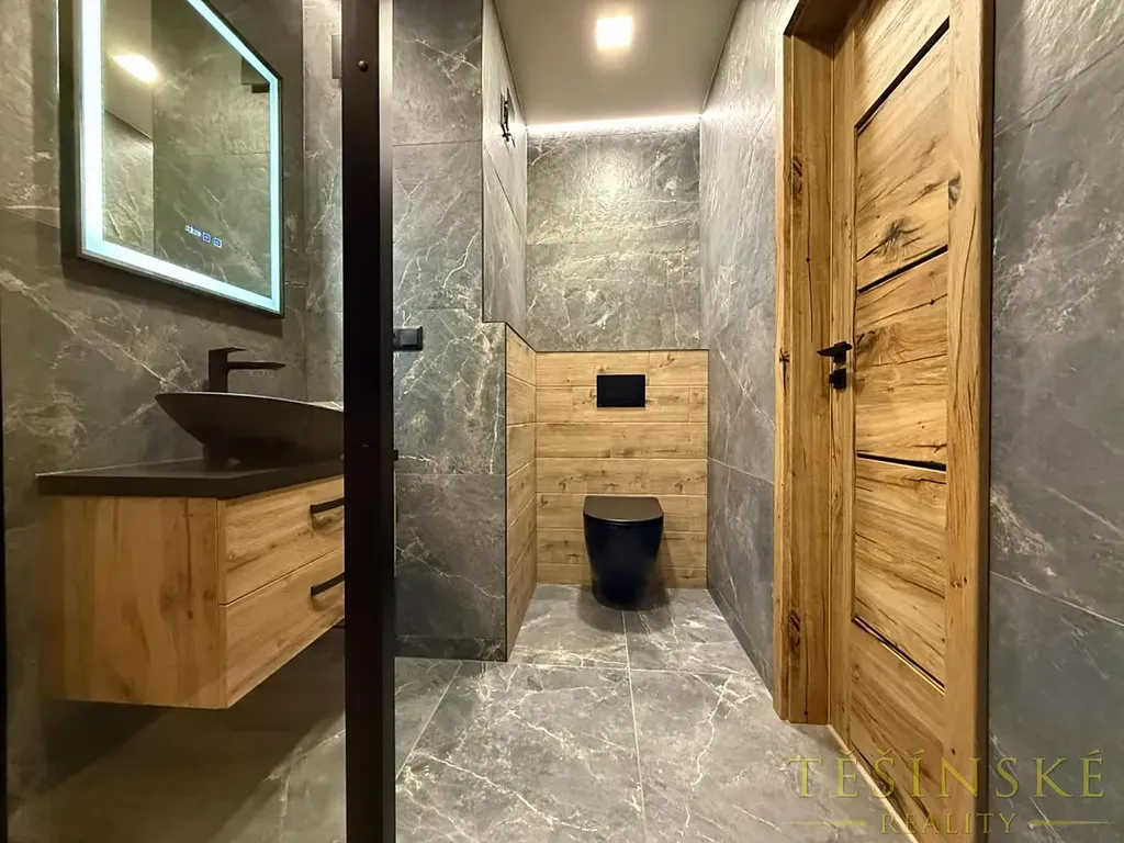 * koupelnu s prostorným sprchovým koutem v moderních velkoformátových obkladech,