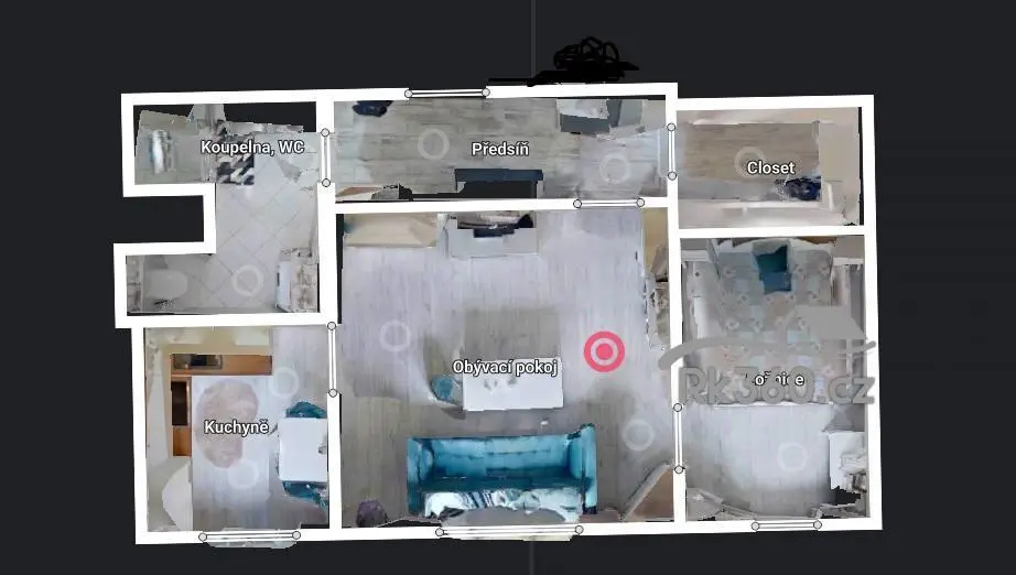 Obývací pokoj: centrální místnost bytu, průchozí do ložnice.
