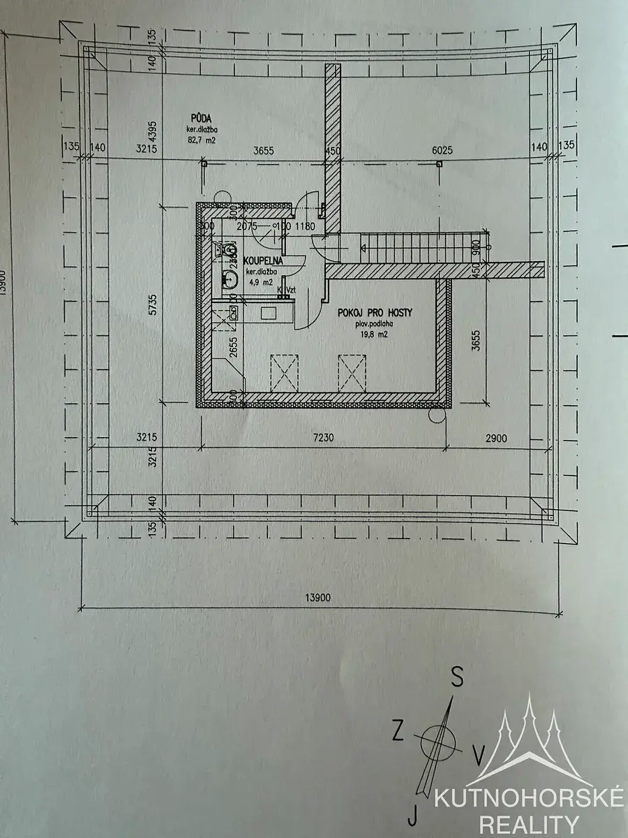 Ve střední části podkroví je navržen pokoj pro hosty s vlastním sociálním zázemím. Vstup do této samostatné části je po jednoramenném schodišti z prostoru přístřešku pro auta. Dispozice je 1+kk, užitná plocha 24,7 m².