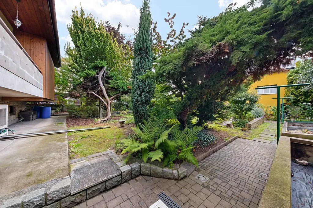 Zahradu s okrasnými a ovocnými dřevinami i dům od lesního pozemku odděluje vysoký zděný plot s brankou a přístupem na lesní pozemek.