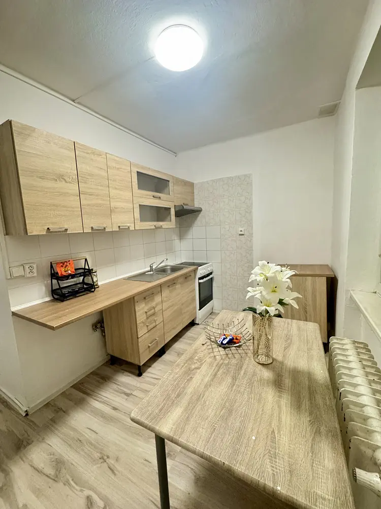 Dispozice bytu zahrnuje dvě samostatné místnosti, kuchyň s prostorem pro jídelní kout, koupelnu a WC. Byt je čistý, udržovaný a vhodný k okamžitému bydlení – ideální pro jednotlivce, pár nebo menší rodinu.