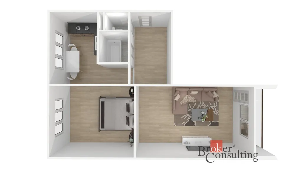 Dispozice zahrnuje dva samostatné pokoje, kuchyň, koupelnu a WC.