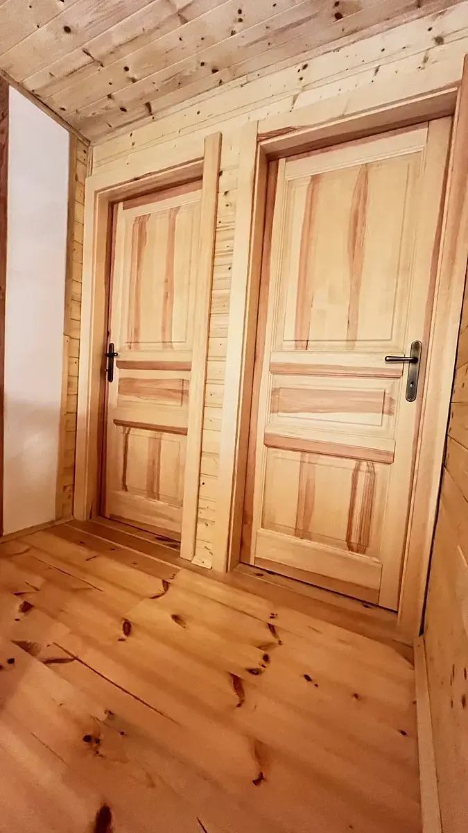 Nový dvoupodlažní dům s dispozicí 4+kk nabízí pohodlné celoroční bydlení pro velkou rodinu. Příjemný velký obývací pokoj s kuchyňským koutem, jídelnou a kamny nabízí příjemnou atmosféru. V přízemí domu se nachází velká ložnice, koupelna se sprchou, toaletou, technickým zázemím, vstup do sklepa. V druhém patře se nachází 2 velkorysé ložnice. Dům je postaven na rovinatém pozemku s výměrou 1.443m2 obklopen lesem. Vytápění je krbovými kamny, elektrickými keramickými kamny. Teplá voda elektr. Bojler. Stavba z masivních smrkových hranolů 30x30 cm a kvalitních materiálů.
