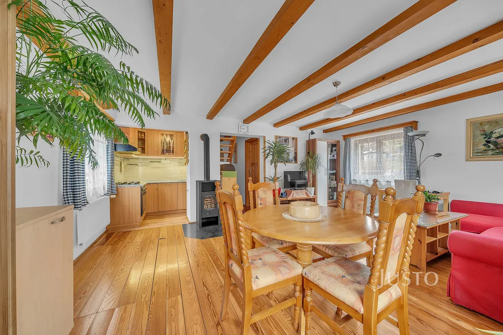 Dům je samostatně stojící, má tři nadzemní podlaží a je částečně vybaven. Interiér působí příjemně díky dřevěným prvkům, kvalitním podlahám a dostatku přirozeného světla. V přízemí najdete prostorný a prosvětlený obývací pokoj, jídelní kout a pracovní místo. V podkroví je otevřený prostor vhodný jako ložnice či další pracovna. Kuchyně je vybavena kuchyňskou linkou, plynovou varnou deskou, troubou a myčkou. V koupelně je k dispozici sprchový kout a v druhé koupelně, která se nachází v suterénu domu je vana. Součástí domu jsou také sítě proti hmyzu a eurookna zajišťující komfortní bydlení.