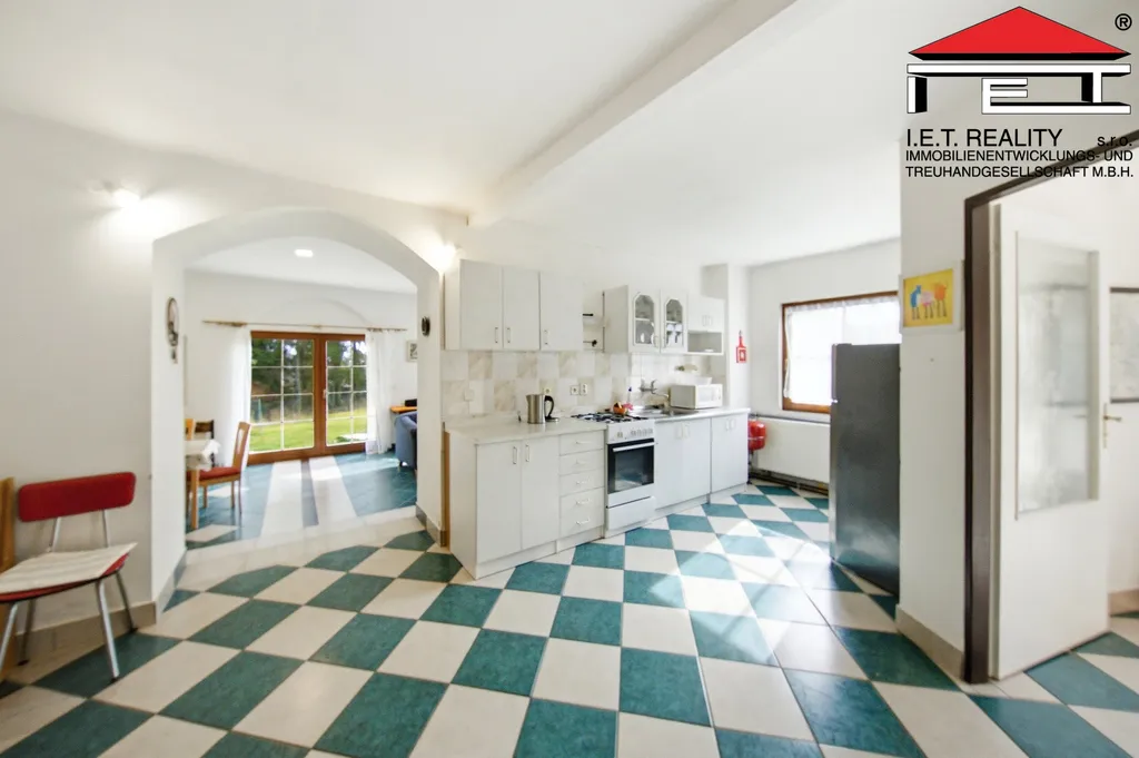 Vila II. - V prostřední budově se nachází plně vybavená kuchyně s barem a výčepním zařízením na pivo-limo, která je volně spojena s prostornou jídelnou (76 m2), gaučem a francouzskými dveřmi do zahrady, WC a koupelna se sprchovým koutem a infrasaunou. Pro ubytování jsou v prvním patře tři dvoulůžkové pokoje, koupelna s rohovou vanou a WC. Ve dvou ložnicích je možnost plnohodnotné přistýlky. Lze ubytovat opět až 8 osob.
