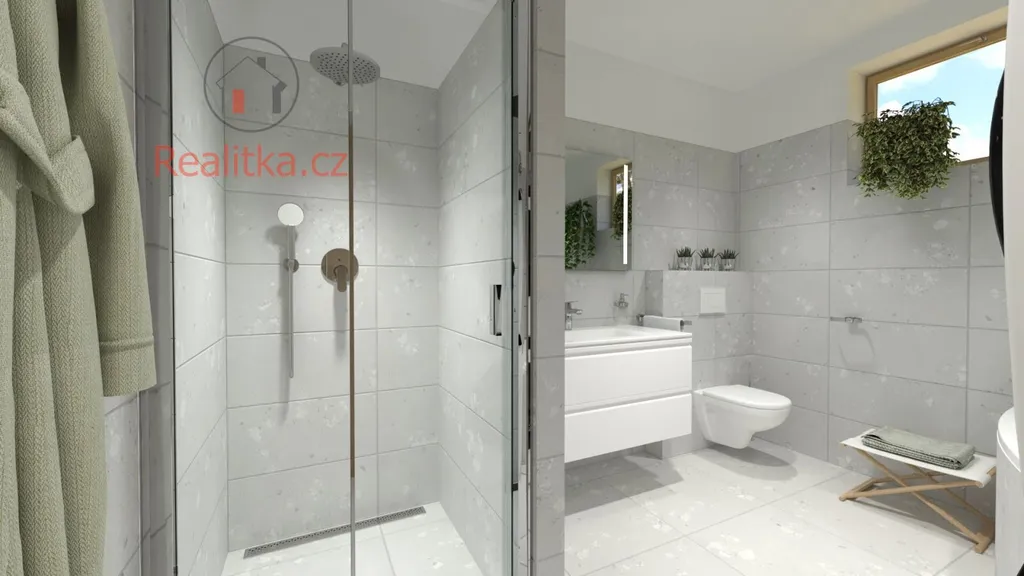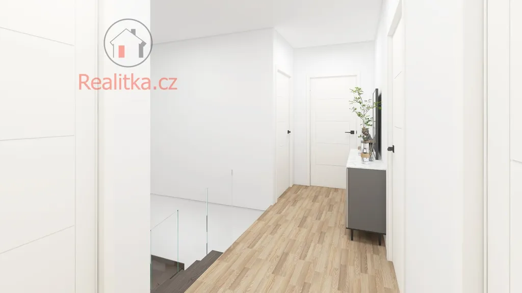 • Přízemí: Prostorná chodba, technická místnost, WC, obývací pokoj s chytře odděleným kuchyňským koutem a terasa navazující na obývací pokoj, čímž se vytváří plynulý přechod mezi interiérem a exteriérem.