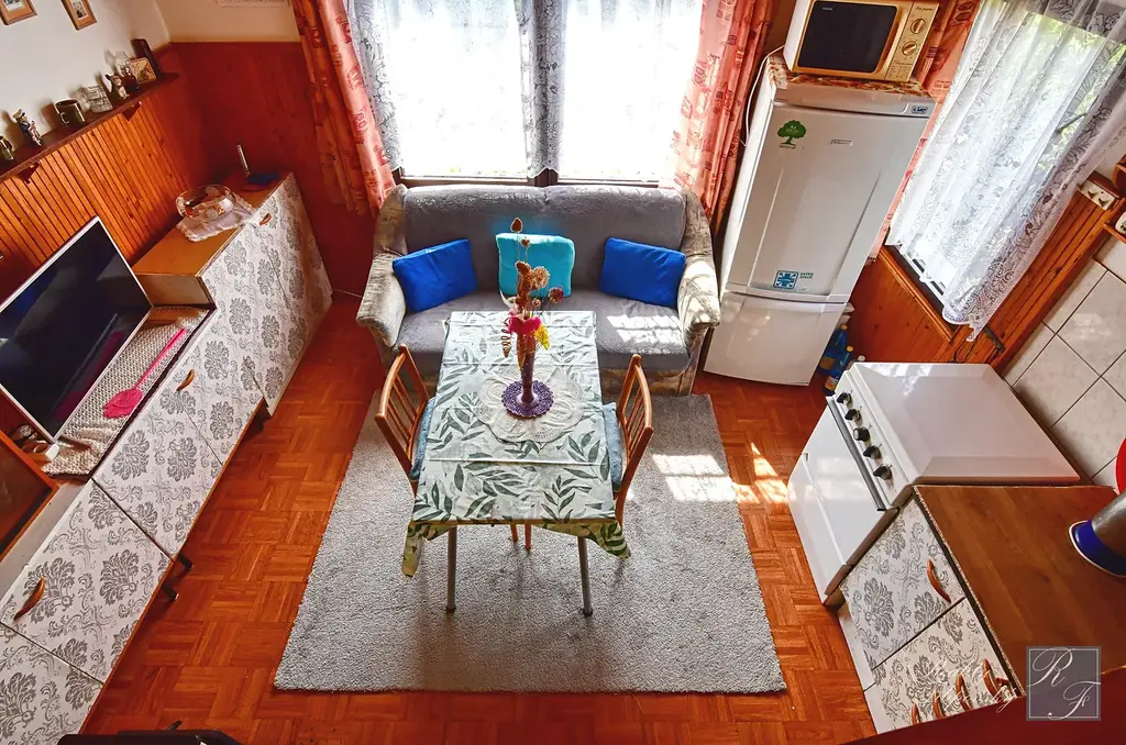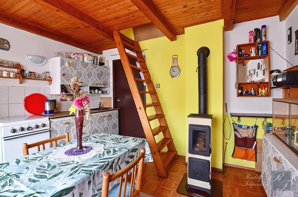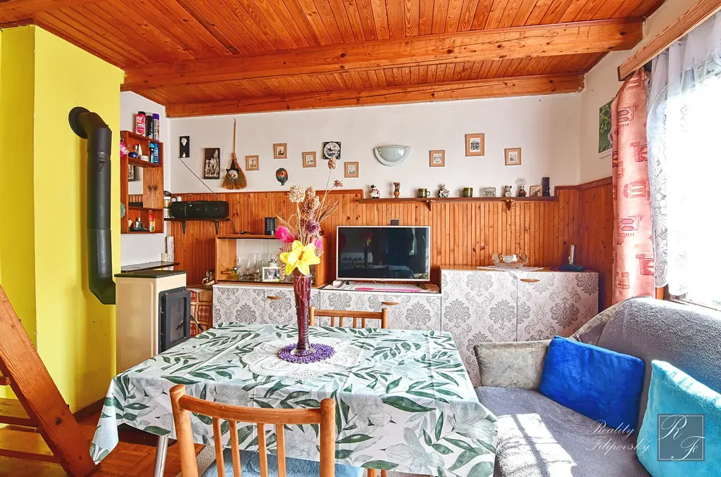 V suterénu se nachází skladovací a technické zázemí s dostatkem prostoru pro veškeré zahradní náčiní. V 1. NP najdeme prostorné zádveří a hlavní obývací prostor s kuchyňským koutem. V podkroví se nachází ložnice, kde se pohodlně vyspí 4 osoby. Na zahradě je vybudováno zastřešené posezení s dostatkem místa pro celou rodinu. Právě z tohoto místa si budete nejvíce užívat již zmiňovaný krásný panoramatický výhled do okolí.