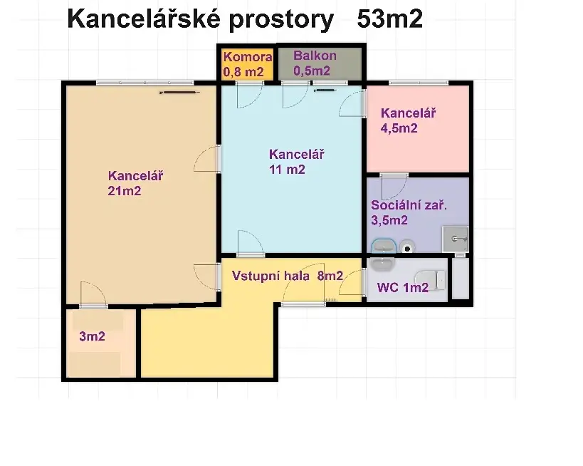 Dispozice: velká kancelář 21 m2, kancelář 11 m2 a malá kancelář 4,5 m2 + chodba, sociální zázemí, komora a balkon.