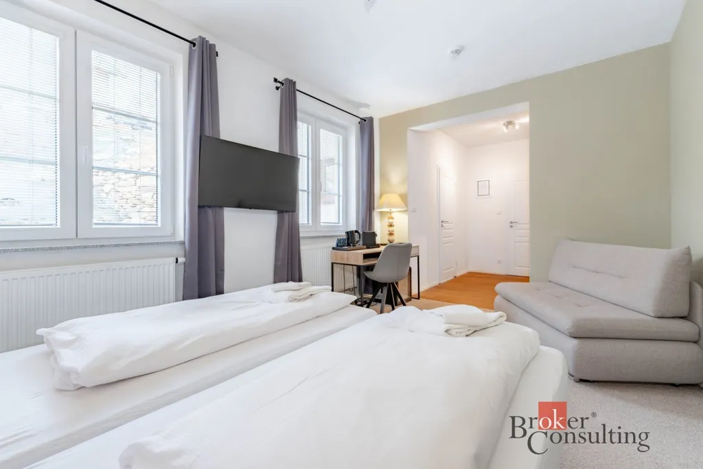 Vyspí se zde pohodlně 3 osoby, v pokoji najdete dvě velmi pohodlné postele, příjemnou pohovku, stolek, křesílko, součástí vybavení je i televizor, rychlovarná konvice a kávovar. Koupelna v moderních barvách dřeva a bílé nabízí sprchu, umyvadlo a wc. V prostorné předsíni je velká vestavěná šatní skříň. Kuchyň zde zatím není, po dohodě lze buď snížit cenu nebo v ceně majitelé zajistí vestavbu menší kuchyňky.