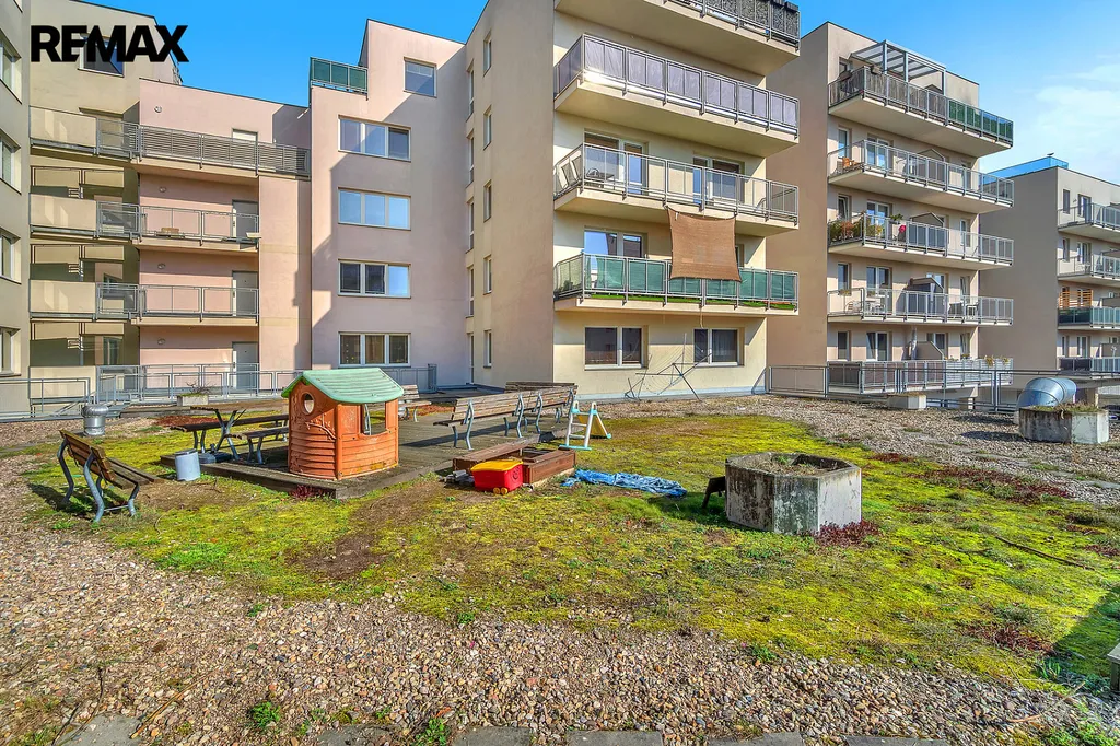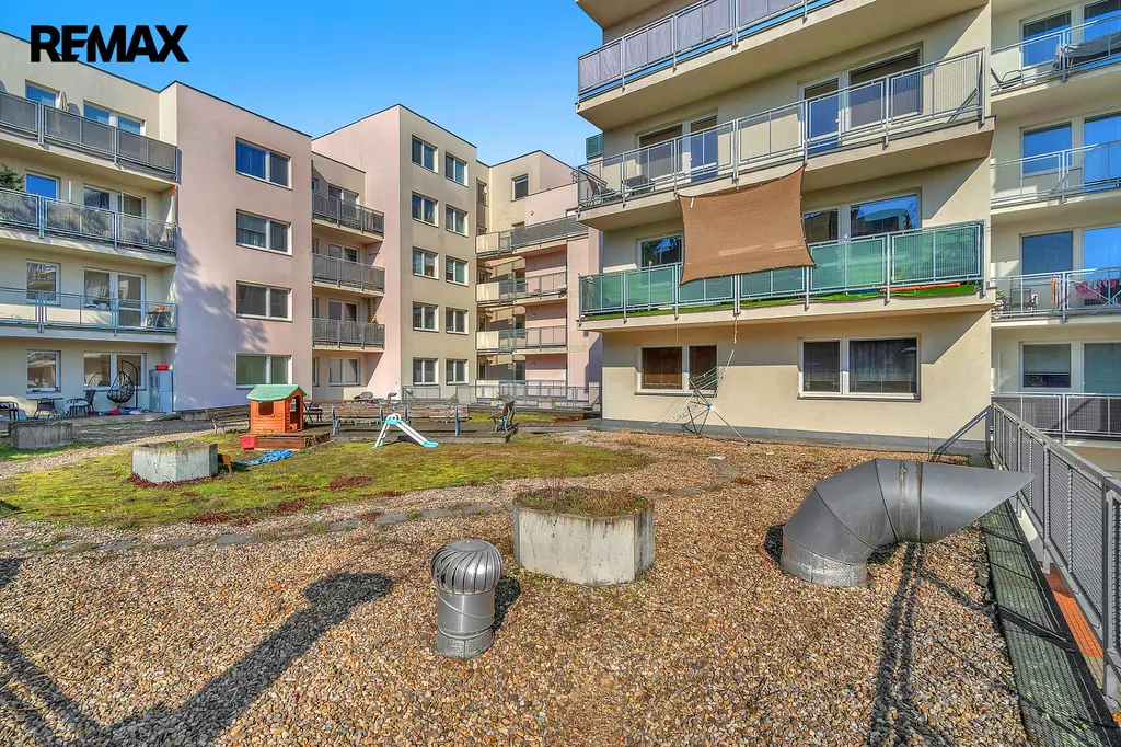 Velkou výhodou je také společný prostor s lavičkami ve vnitrobloku, ideální pro relaxaci nebo příjemné posezení v teplých dnech.