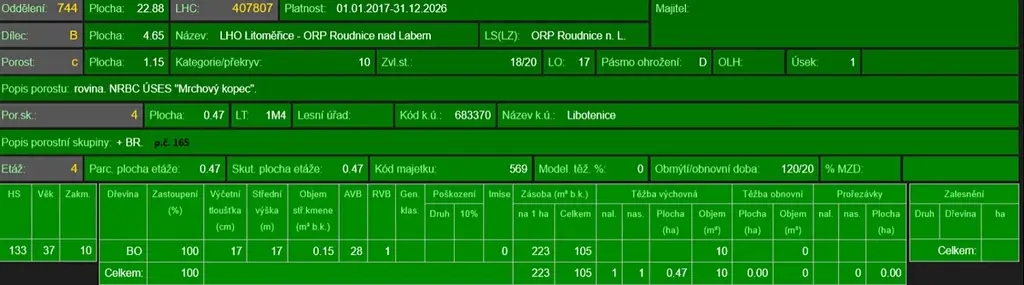 - p.č. 165 vedená jako lesní pozemek o celkové výměře 50 289 m2 (stáří lesa 108 let - zastoupení dřevin akát, borovice, dub, stáří 54 lesa let - zastoupení dřevin borovice, stáří lesa 46 let - zastoupení dřevin borovice, stáří lesa 44 let - zastoupení dřevin borovice, akát, modřín, stáří lesa 24 let - zastoupení dřevin akát).