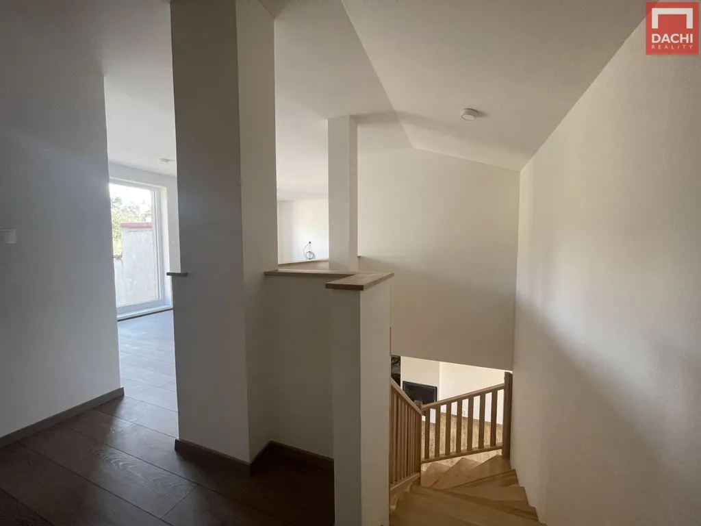 Dispozice 5+kk poskytuje dostatek prostoru pro rodinné bydlení i práci z domova. Přízemí o výměře 66 m je prakticky řešeno nachází se zde koupelna se sprchovým koutem a umyvadlem, samostatné WC se splachovacím systémem Geberit, technická místnost a pokoj vhodný jako pracovna či pokoj pro hosty. Hlavní obytný prostor tvoří obývací pokoj propojený s kuchyňským koutem, kde dominuje krb s teplovzdušným rozvodem. Odtud vede do podkroví schodiště s kovovou nosnou konstrukcí a dřevěnými stupni.