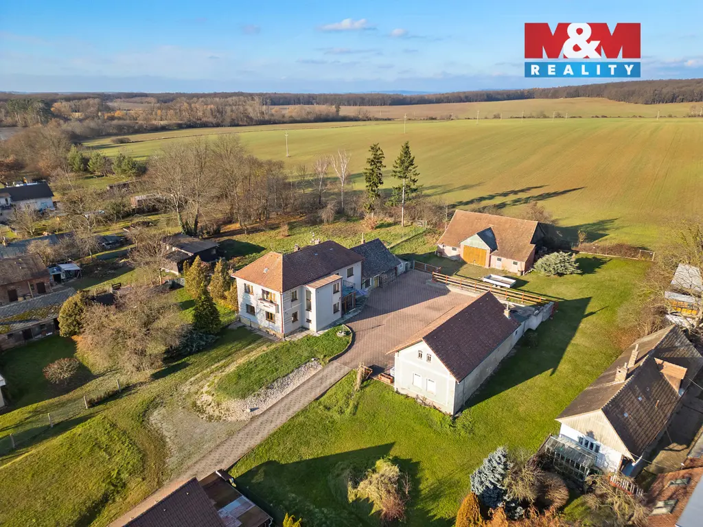Součástí prodeje je garážové stání pro jedno vozidlo, podíl na stodole (včetně půdních prostor) a podíl na pozemku o celkové výměře 2 920 m².