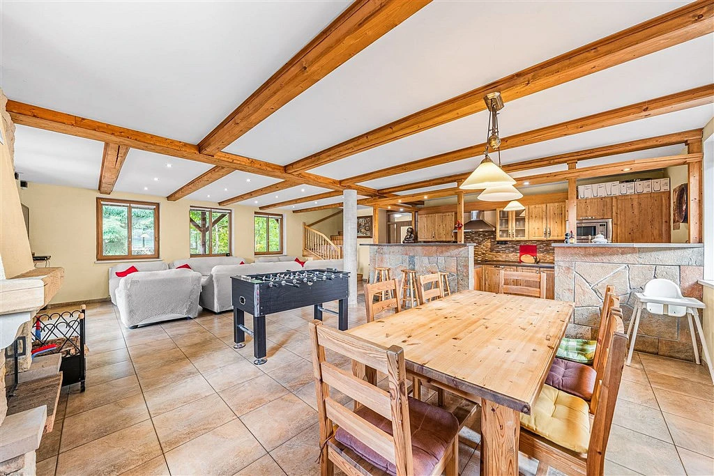 Srdcem domu je prostorná společenská místnost s krbem a plně vybavenou kuchyní, která vybízí ke společným chvílím po dni stráveném na svahu či v přírodě. Přímo navazuje velká zastřešená terasa, ideální pro posezení s výhledem na okolní šumavskou krajinu.