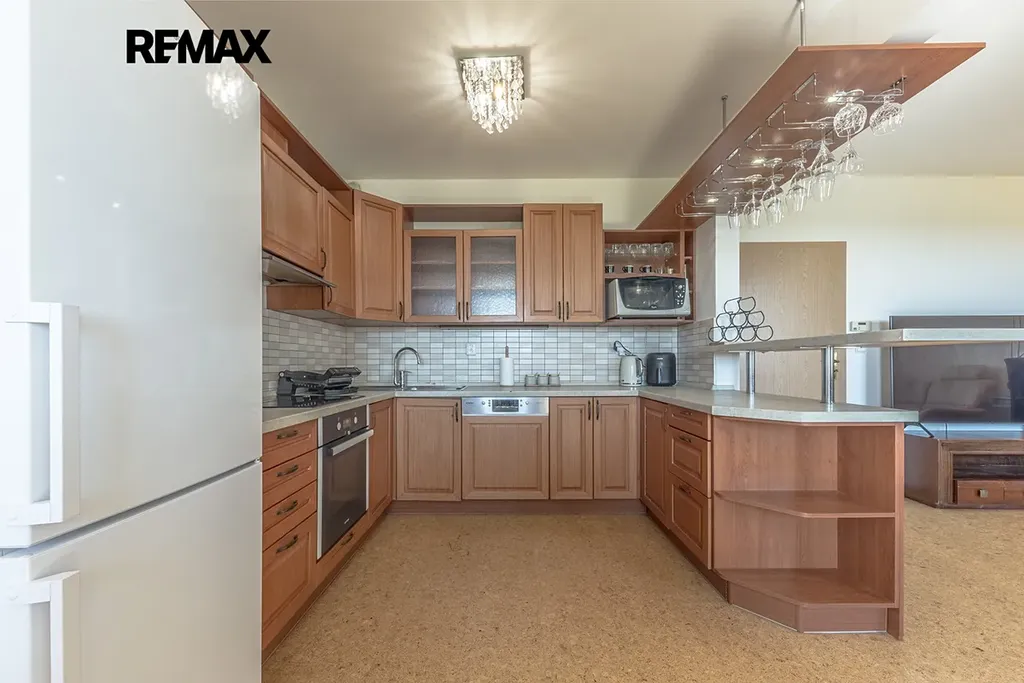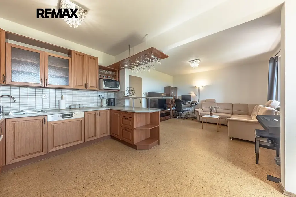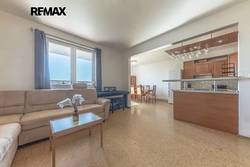 Dominantou bytu je prostorný obývací pokoj propojený s kuchyňským koutem a jídelní částí, který tvoří přirozené srdce celého bytu. Nabízí dostatek místa pro rodinný život i posezení s přáteli a zároveň přímý vstup na prostornou lodžii.
