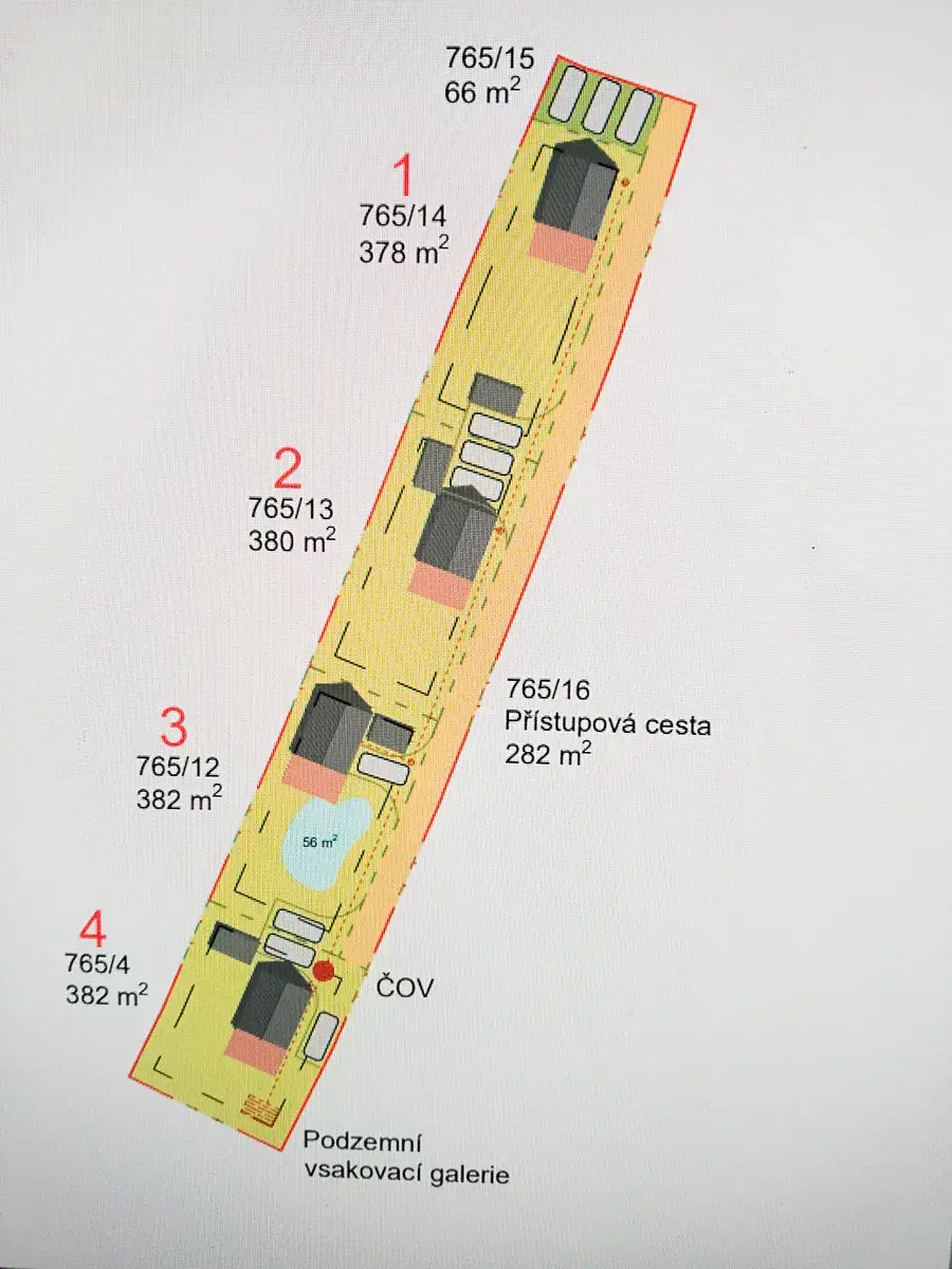 Na pozemku lze postavit až čtyři domky o zastavěné ploše 40 m2, přízemí, patro a možnost podsklepení.