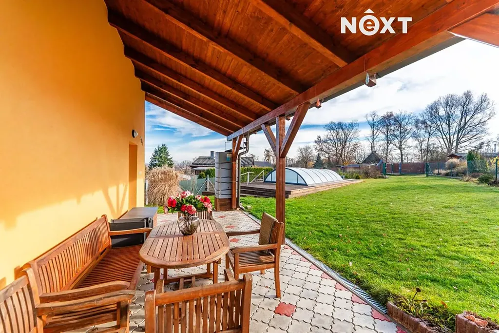 Velkorysý pozemek o rozloze 1 495 m² poskytuje naprosté soukromí a krásný prostor obklopený zelení. Na zahradě najdete zastřešený 7metrový bazén, který nabízí relaxaci po velkou část roku. K tomu příjemná zastřešená terasa, ideální pro večerní posezení, grilování nebo odpočinek u kávy. Částečné podsklepení se sklepem o 10 m² je praktickým místem pro uskladnění vybavení i sezónních věcí.
