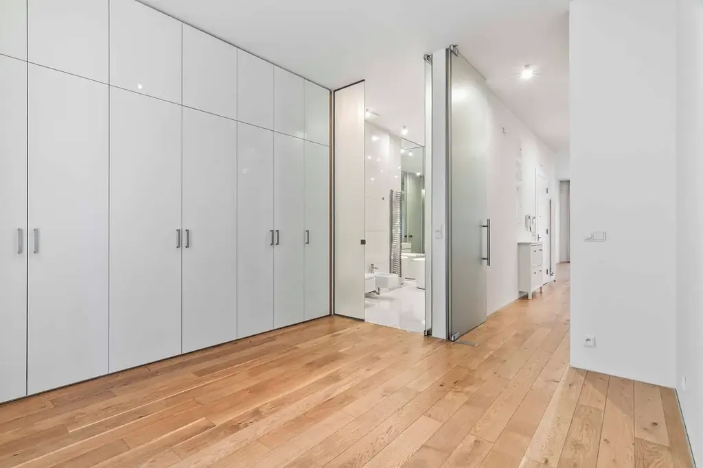 Hlavní část bytu představuje prostorný obývací pokoj s kuchyňskou linkou s vestavěnými spotřebiči v nadčasovém provedení a přímým vstupem na terasu. Dispozice dále zahrnuje dvě ložnice, koupelnu s vanou a toaletou a druhou koupelnu se sprchovým koutem a toaletou. Praktické uspořádání poskytuje komfortní zázemí pro každodenní život.