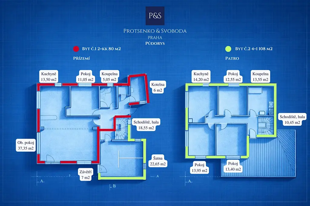 • Patro: 78 m² (samostatná kuchyň – ideální pro rozdělení jednotek)