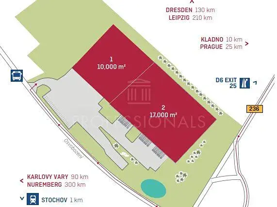 Logistický areál P3 Prague D6 se nachází na exitu 25 dálnice D6 (Praha - Karlovy Vary - Německo), je vzdálen 20 min od Prahy. Areál je dobře viditelný. Současným nájemcem je například spol. Arvato Services. Konkrétní dostupnost prostor na dotaz. Volná část haly DC2 - sklad 6564 m2 + 459 m2 kanceláře se zázemím.