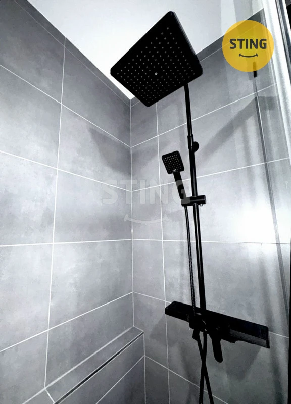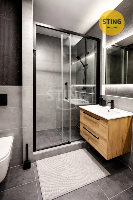 Koupelna je řešena ve stylovém tmavém provedení a nabízí prostorný sprchový kout s moderními prvky, závěsné WC a designové umyvadlo se skříňkou. Je zde vyhrazený prostor pouze pro menší pračku s vrchním plněním. Samozřejmostí je i vyhřívaný žebřík na ručníky.