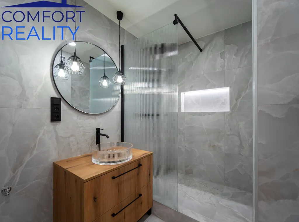 Interiér vás nadchne svou světlostí a moderním pojetím. Nová kuchyňská linka vyrobená na míru od stolaře, osazená kvalitními vestavnými spotřebiči. Celý prostor sjednocují zátěžové plovoucí podlahy a elegantní bílé interiérové dveře. Atmosféru dotvářejí vkusné sádrokartonové podhledy s bodovým osvětlením. Koupelna s moderními obklady disponuje prostorným sprchovým koutem a novou sanitou, přičemž v rámci rekonstrukce byly provedeny i kompletní rozvody elektřiny, vody a odpadů.