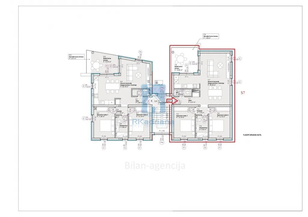 Byt má vynikající dispozici, pokoje jsou světlé a vzdušné. Skládá se z chodby, koupelny, samostatné toalety, 2 ložnic a prostorné kuchyně. Otevřený koncept jídelny a obývacího pokoje je navíc propojen velkými posuvnými dveřmi s krásným balkonem, který je z větší části krytý. K bytu patří jedno parkovací místo v oploceném dlážděném dvoře budovy. Byt je vybaven podlahovým vytápěním, klimatizačními invertorovými jednotkami, kvalitními okny a dveřmi s vestavěnou ochranou proti hmyzu a elektrickými roletami. Kvalitní keramické obklady a moderní koupelnové vybavení. Možnost okamžitého nastěhování. Budova, která se skládá z přízemí a dvou pater, má celkem 7 bytů. Vzdálenost do centra města je 750 m.
