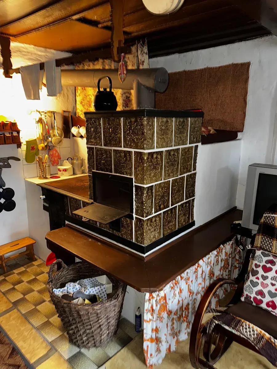 Srdcem chalupy je severní křídlo, které slouží jako plnohodnotná obytná část. Hned po vstupu vás přivítá prostorná vstupní předsíň, která přirozeně navazuje na ostatní místnosti. Dominantou interiéru je bezpochyby obytná kuchyně s kachlovými kamny a pecí – místo, kde se v zimních večerech sbíhá celá rodina, kde vůně domácího pečení splývá s teplem praskajícího dřeva a kde čas prostě stojí. Tato místnost sama o sobě je důvodem, proč do chalupy přijít a proč se do ní zamilovat.