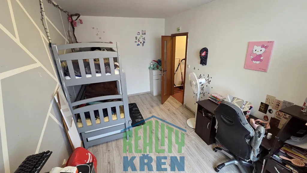 Vstupní chodba 8,7 m2, kuchyně 6,1 m2, obývací pokoj 25,8 m2, 2x ložnice (12,9 m2 a 9,8 m2), koupelna s vanou 2,6 m2, samostatné WC. K bytu náleží komora na patře 0,7 m2.
